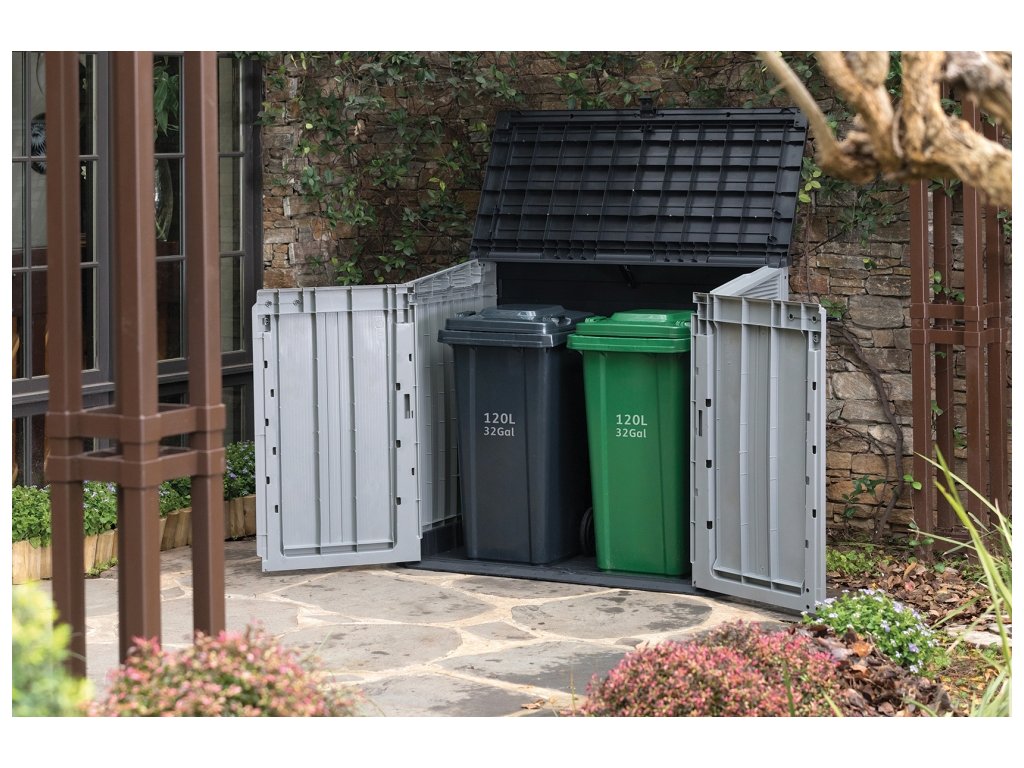 - úložná skříň je vyrobena z nejkvalitnějšího plastu se strukturou imitující dřevo a odolnému vůči UV záření