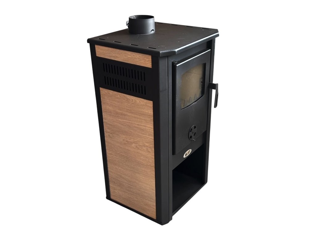 Tělo kamen z ocelového plechu je doplněno keramickými deskami na bocích v provedení s dekorem dřeva.