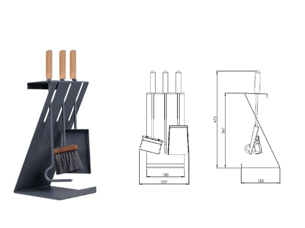 Sada nářadí pro krby a krbová kamna obsahující pohrabáč, lopatku a košťátko.
