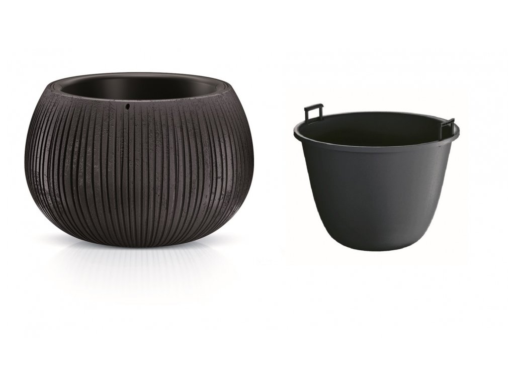 Plastový květináč s vkladem, drážkovaným designem a texturou povrchu v imitaci betonu. Díky použití plastu jako hlavního materiálu je odolnější nárazům než klasické květináče z keramiky.