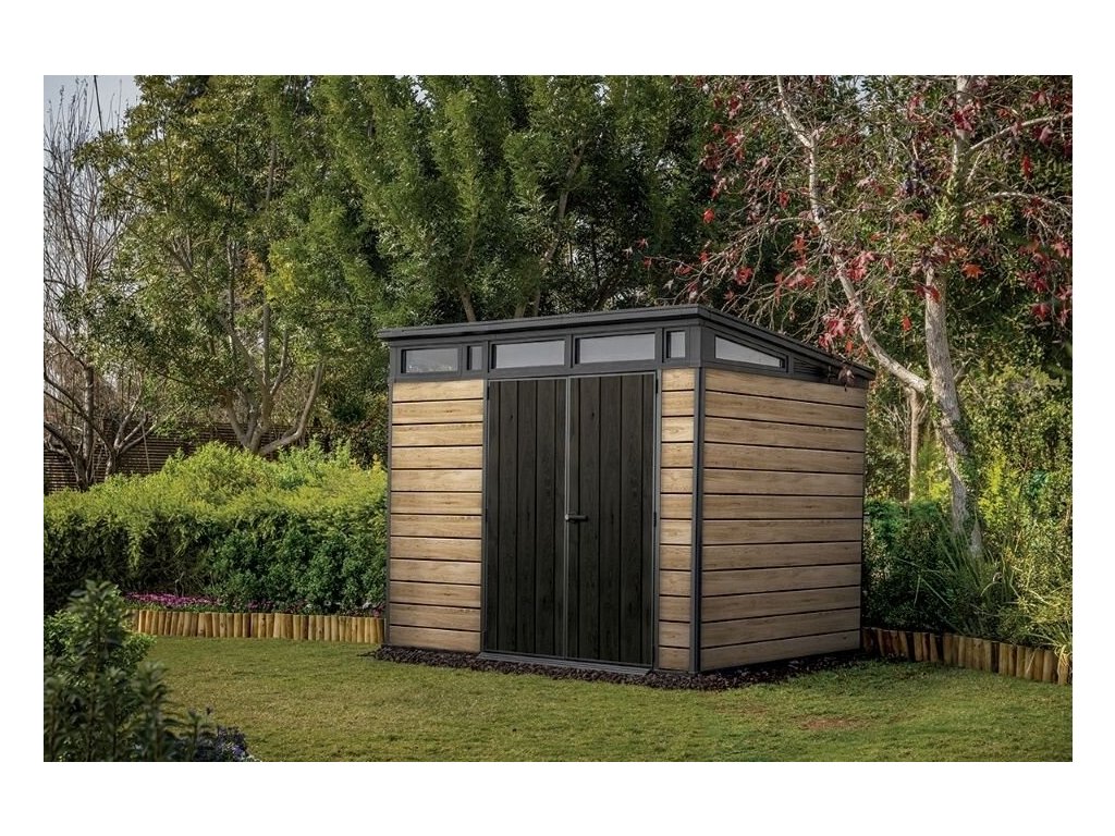 Bezúdržbový domek PENT 9x7 je vyroben z jedinečného materiálu DECOCOAT, který je inspirován moderním vzhledem v imitaci dřeva. Domek má robustní konstrukci s dvojitými stěnami a kovové výztuhy.