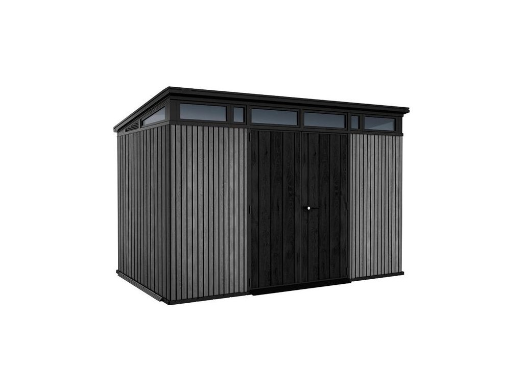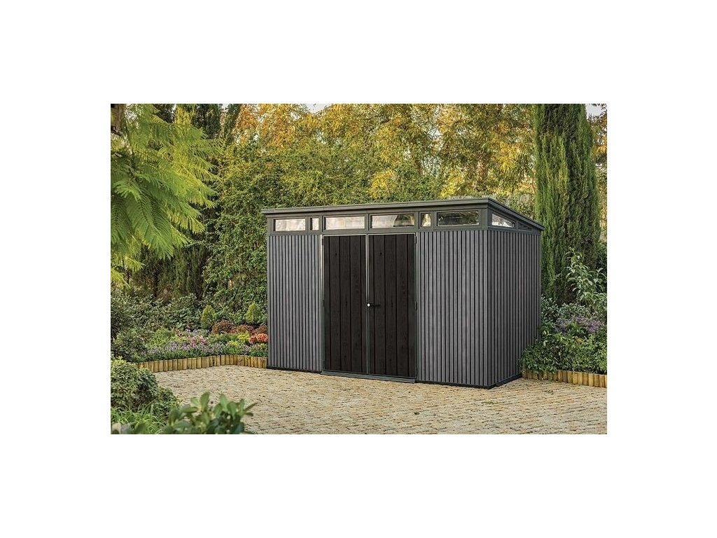 Bezúdržbový domek PENT 11x7 je vyroben z jedinečného materiálu DECOCOAT, který je inspirován moderním vzhledem v imitaci dřeva. Domek má robustní konstrukci s dvojitými stěnami a kovové výztuhy.