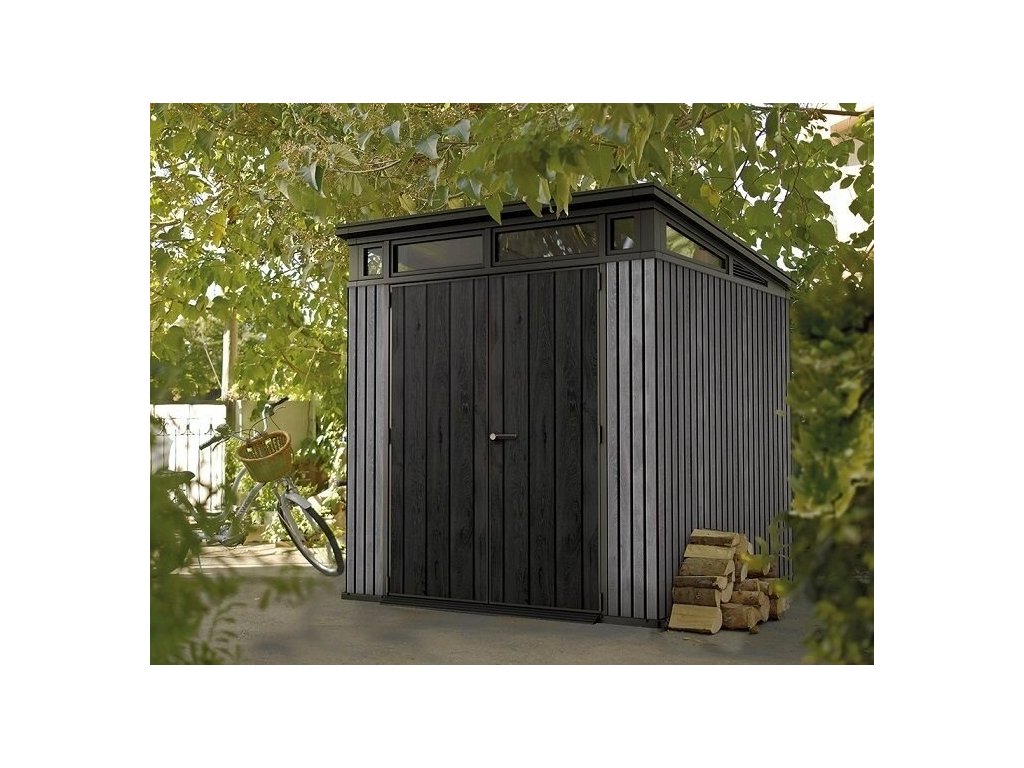 Bezúdržbový domek PENT 7x7 je vyroben z jedinečného materiálu DECOCOAT, který je inspirován moderním vzhledem v imitaci dřeva. Domek má robustní konstrukci s dvojitými stěnami a kovové výztuhy.