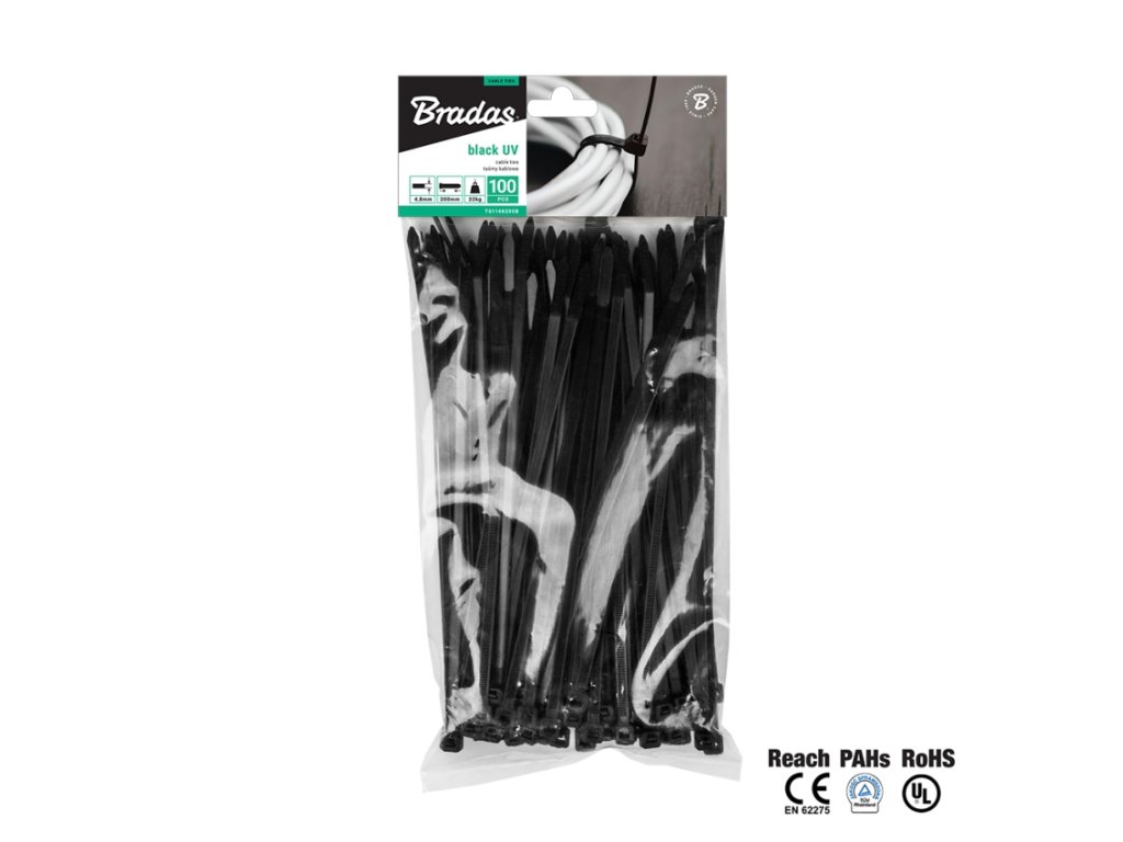 Stahovací pásky plastové 3,6x200mm BRADAS UV BLACK - 100ks