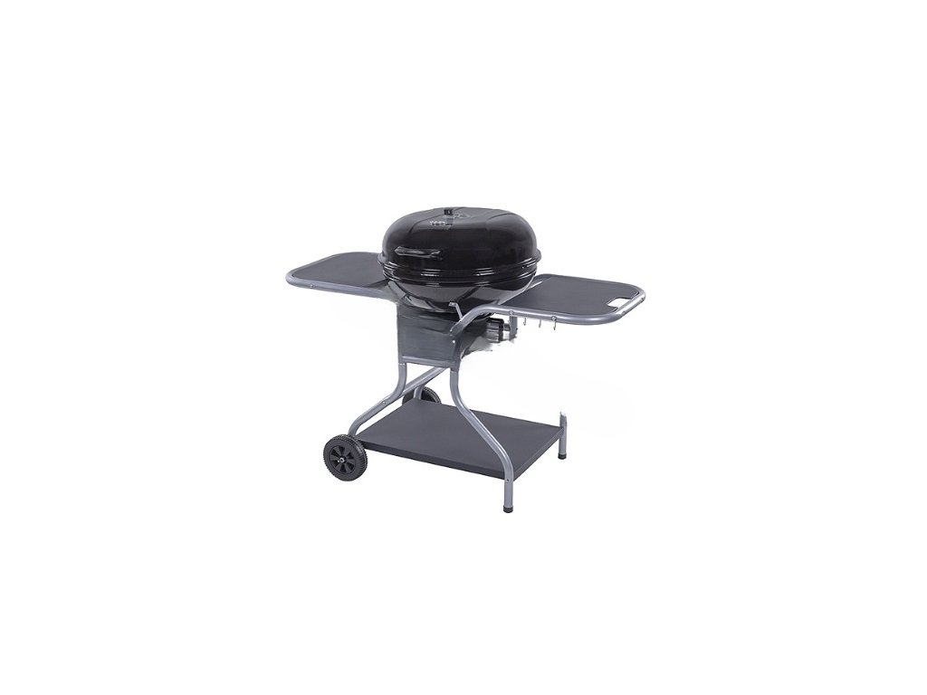 Velký zahradní kotlový gril na dřevěné uhlí s poklopem a bočnimi odkládacími policemi. Gril má dvojí regulaci proudění vzduchu.Topeniště je vybaveno nejen velkým chromovaným grilovacím roštem, ale také roštem na dřevěné uhlí. Spodní část topeniště je opatřena popelníkem s regulací intenzity hoření. Kola slouží ke snadné manipulaci s grilem. Spodní část grilu tvoří odkládací police. Vrchní police je doplněna háčky pro zavěšení grilovacího náčiní.