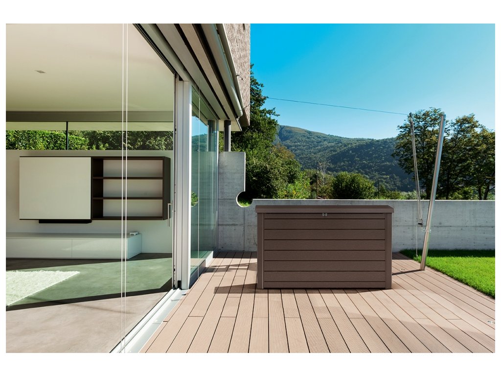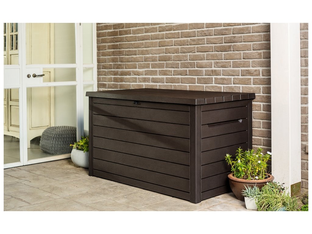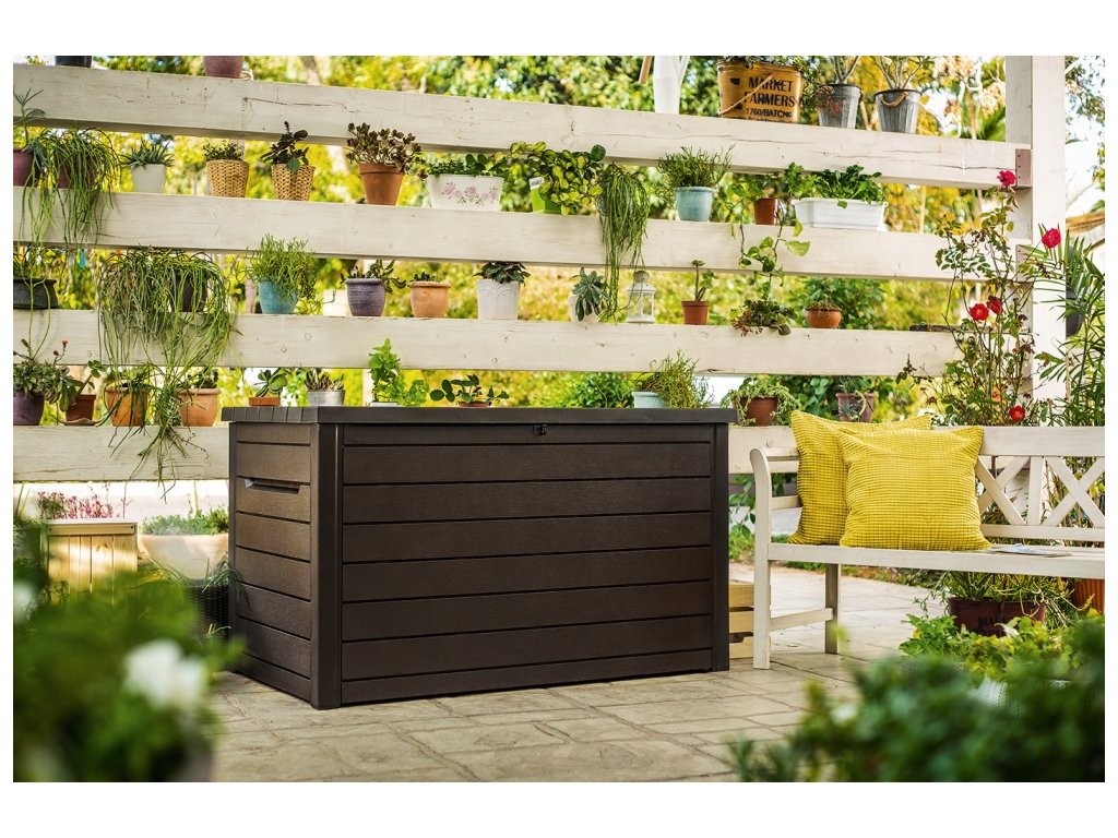 Složení skříně zvládnete během krátké chvíle bez použití jakéhokoliv nářadí. Zahradní box je vyrobený z vysoce kvalitního materiálu odolného vůči povětrnostním vlivům s UV ochranou pro stálou barvu na slunci. Imituje dřevo a jeho strukturu, v kombinaci s hnědou barvou představuje velmi moderní design.