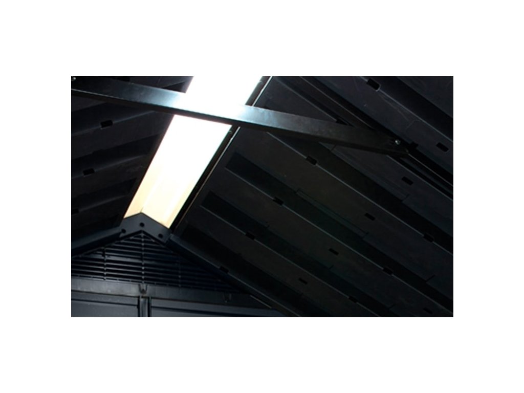 - Domek má extra silnou sedlovou střechu, která vydrží zatížení až do 150 kg/m²
