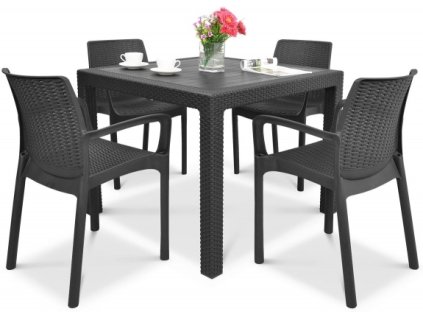 Zahradní set BALI/MELODY Quartet je vyroben z vysoce kvalitního polypropylenu s přírodní strukturou ratanu. Set se skládá ze 4 pohodlných židlí a funkčního čtvercového stolu. Deska stolu má otvor pro deštník, který lze zavřít zátkou. Nábytek je odolný vůči měnícím se povětrnostním podmínkám. Židle mají zespod na nohou protiskluzovou úpravu, která brání smýkání na mokrém a vlhkém povrchu. Židle lze také na sebe naskládat pro pohodlné uskladnění šetřící místo.